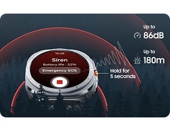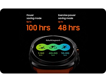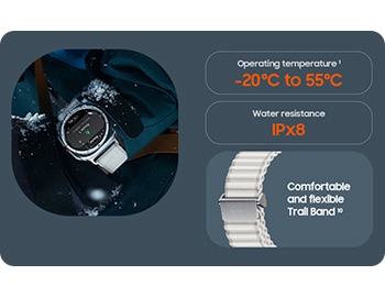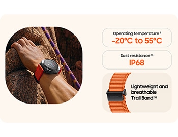 - Compared to earlier Galaxy Watch series. Galaxy Watch Ultra withstands temperatures ranging from -20°C to 55°C while being worn on the wrist, based on results from internal lab tests conducted by Samsung. Actual performance may vary depending on the environment where it is used. In very high or low temperatures, charging may be blocked, certain functions may be automatically terminated or unavailable, or the watch may shut down automatically for safety. Additionally, battery performance can be adversely affected at low temperatures. Galaxy Watch Ultra is dust resistant with an IP6X rating based on testing conducted by a third party. Testing conditions: 2 kg of talc powder (max. diameter of 0.05 mm) per cubic metre was blown into a test chamber housing the device (air pressure within device kept below surrounding air) for 2 hours. Dust resistance may vary by actual usage conditions. Trail Band is sold separately. ↩