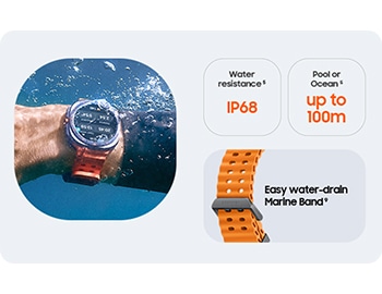 - Galaxy Watch Ultra is water resistant for up to 10 minutes in water with depth of 100 metres according to ISO22810 standard. The test was conducted in 5% salty water and 4 ppm chlorine water. Galaxy Watch Ultra has an IPx8 rating based on submersion in up to 1.5 metres of fresh water for up to 30 minutes. It is not suitable for high-pressure water activities and diving. It may be used for shallow-water activities like swimming in a pool or ocean. Water resistance is not a permanent condition and can diminish over time. Refer to the user manual for further information, including care/use instructions. Additional Watch bands are sold separately. ↩